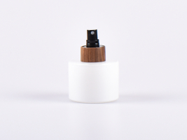 Stilvolle runde, niedrige Weissglasflasche mit Zerstäuber, eingefasst mit echtem Nussbaumholz. Unsere hochwertige Flasche bietet nicht nur eine robuste Verpackung für Ihre flüssigen Produkte, sondern schützt auch empfindliche Inhaltsstoffe vor schädlichen UV-Strahlen.