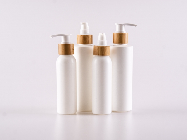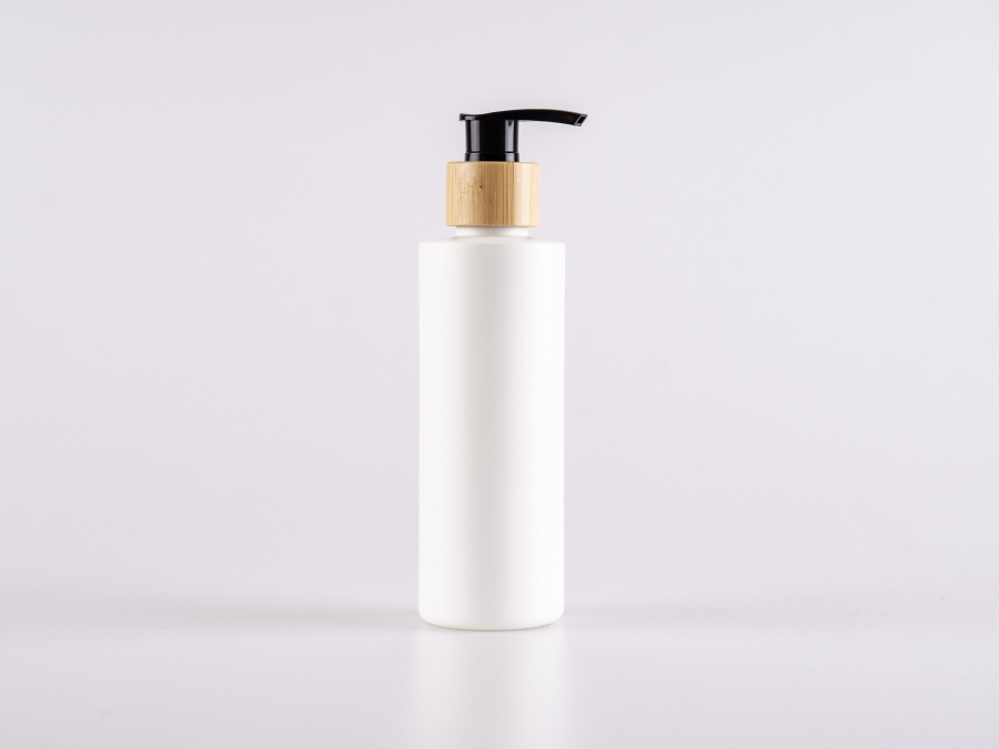 Hochwertige, elegante Lotionsflasche. Der Dispenser ist mit echtem Bambus veredelt.