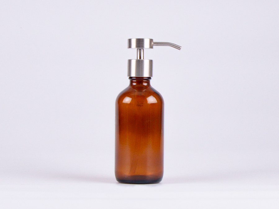 Auf der braunen Glasflasche – der Edelstahl-Dispenser fügt sich harmonisch ein und unterstreicht den Charakter des Inhalts, ohne sich in den Vordergrund zu drängen.