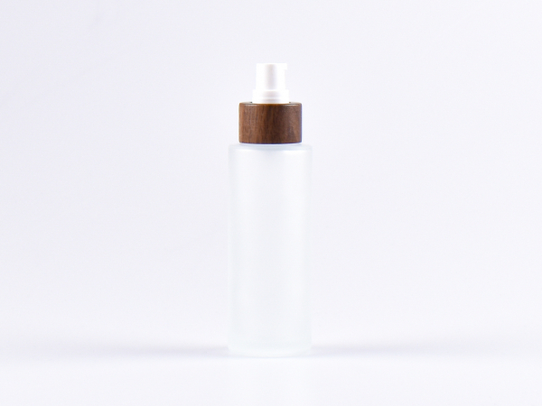Edle, hochwertige Lotionsflasche aus säuremattiertem Glas. Die Lotionspumpe ist mit echtem Nussbaumholz veredelt.